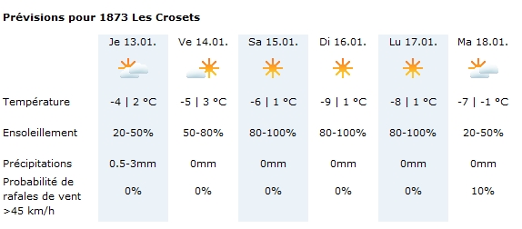 Bref, revenons en France et ici une longue période douce et ensoleillée va s'installer d'ici deux jours et il est prévu 14°C tous les jours ! Par contre les stations vont prendre cher !